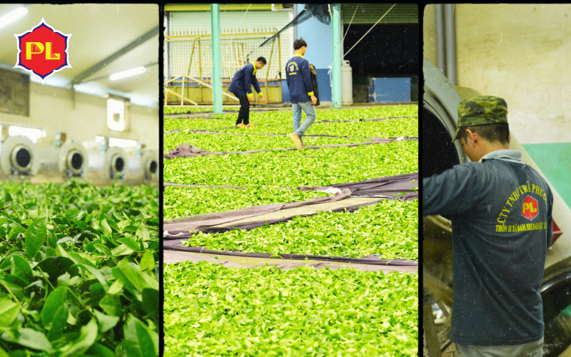 - Héo nắng: Trà tươi sẽ được rải đều và phơi dưới ánh nắng nhẹ hoặc có thể được che bởi dàn lưới để không làm trà quá khô, đảm bảo quá trình sinh hóa tự nhiên và hình dáng đẹp về sau.